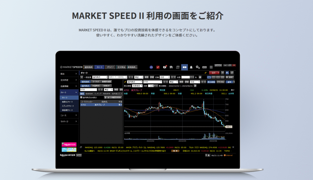 楽天証券の口座開設している人ならだれでも無料で使えるチャート分析ツールで、多くの投資家に愛用されています。著者自身も株式投資を始めたときに7社以上のネット証券口座を試しましたが、最終的に「使いやすさ」でマーケットスピードⅡを選びました。
