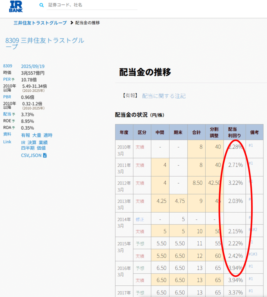 以下の赤枠部分で、銘柄ごとの 過去の配当利回り を簡単にチェックできます。